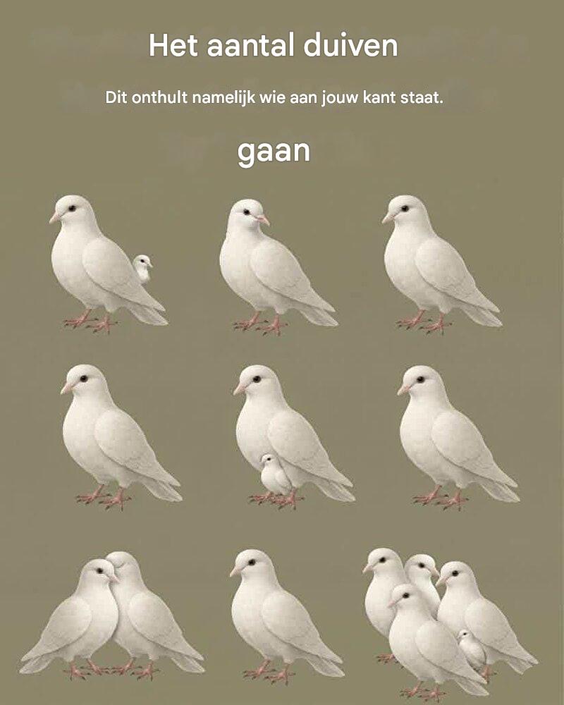Duiven symboliseren al eeuwenlang vrede, liefde, bescherming en spirituele aanwezigheid. In veel culturen worden ze gezien als boodschappers – een brug tussen de fysieke en de onzichtbare wereld. Dus wanneer je gevraagd wordt hoeveel duiven je als eerste opmerkt, is dat meer dan alleen een observatieoefening. Het wordt een weerspiegeling van je eigen innerlijke wereld.