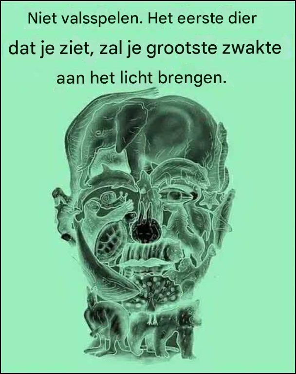 De afbeelding hieronder lijkt op een volledig menselijk gezicht, maar is opgebouwd uit verschillende dieren, waarbij elk dier een gebrek van de persoon in kwestie vertegenwoordigt.