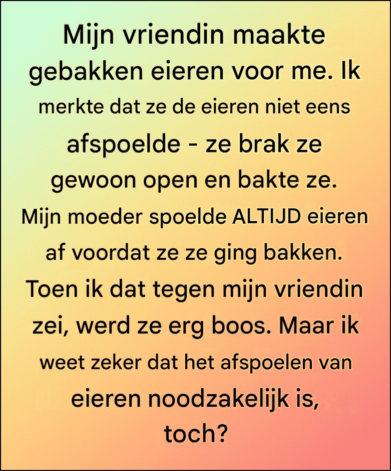 De sfeer in de keuken werd zwaarder. Het ging niet om eieren. Het ging zelfs niet om een correctie. Het ging om de stille vergelijking die in zijn woorden verborgen lag. Ze was vroeg opgestaan om iets aardigs te doen, en in plaats van een glimlach of een simpel bedankje hoorde ze een onuitgesproken norm waaraan ze niet had voldaan.