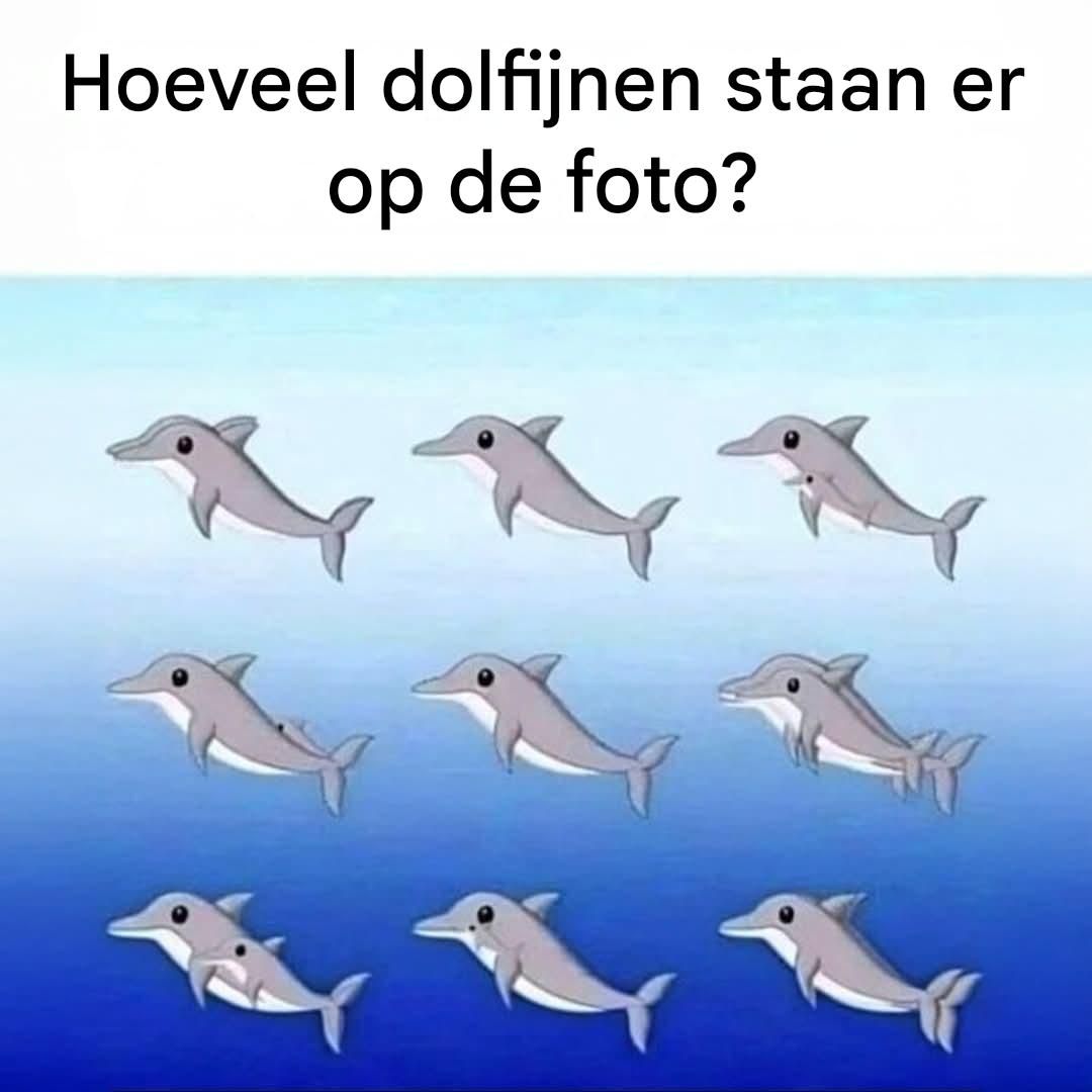 Het officiële antwoord van de bedenkers van deze illusie is verrassend: er zijn 17 dolfijnen in de afbeelding verborgen. Ja, 17. En toch haken veel mensen al lang voor dat getal af.