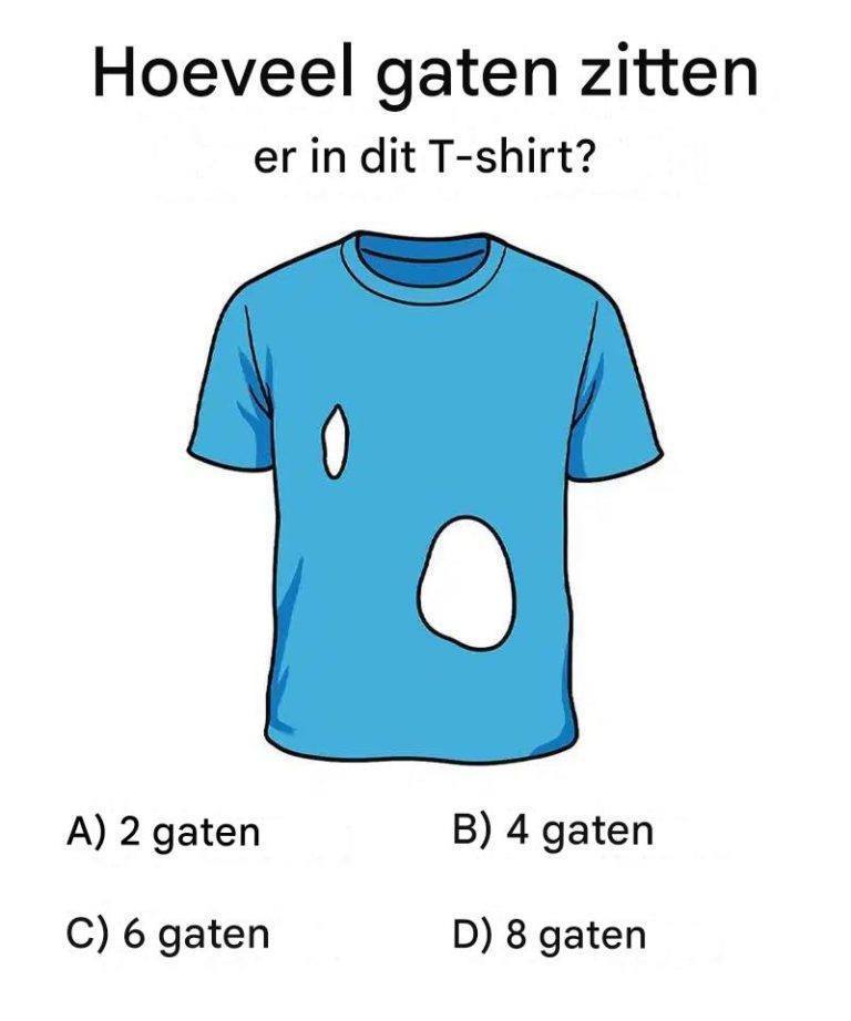 2 (mouwen) + 1 (hals) + 1 (onderkant) + 4 (scheuren aan voor- en achterkant) = in totaal 8 gaten.