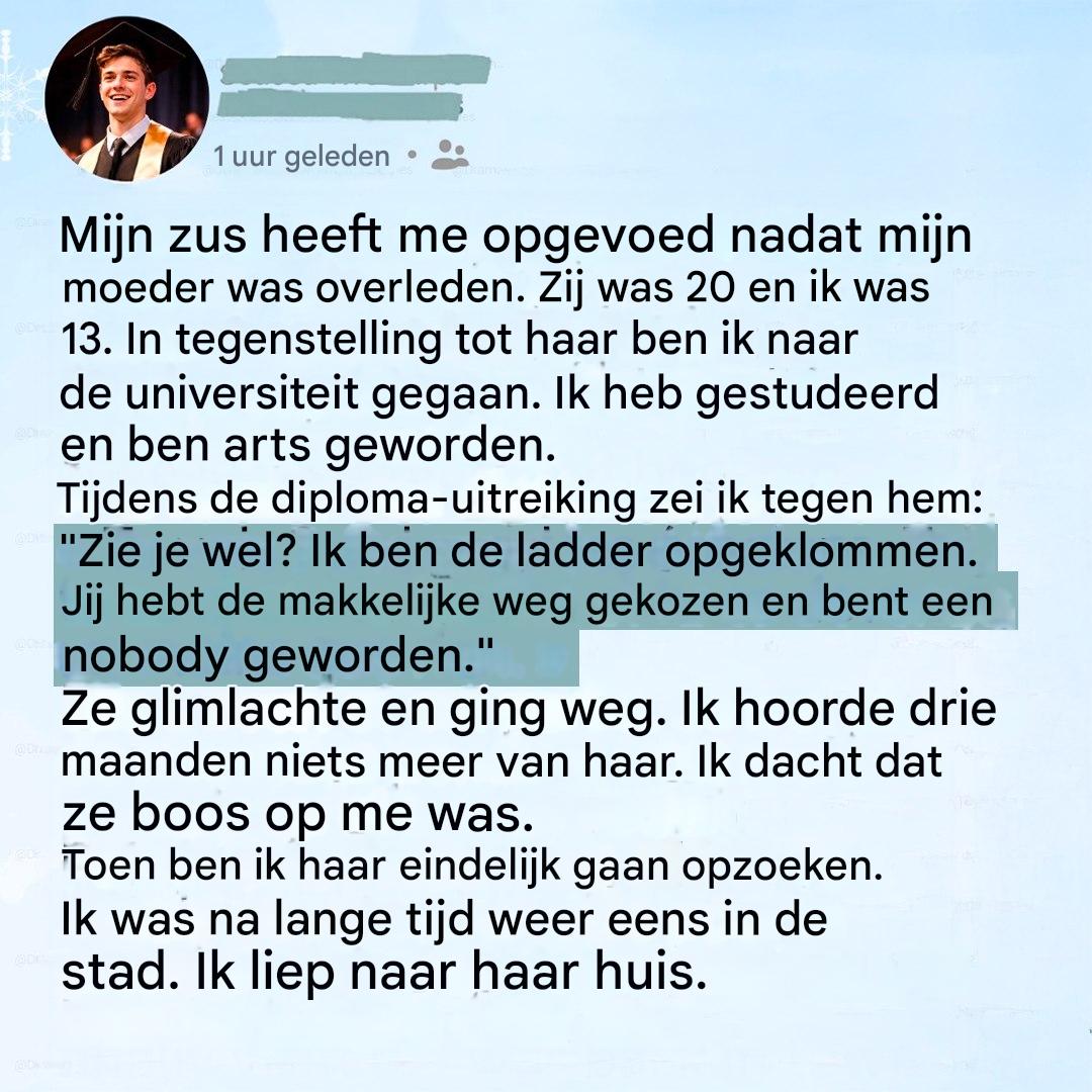 Soms denken we precies te weten waar ons succes vandaan komt. We schrijven het toe aan hard werken, discipline en persoonlijke verdienste. En dan, op een dag, herinnert een harde waarheid ons eraan dat achter elke overwinning vaak iemand staat die zich op de achtergrond heeft gehouden. Dit verhaal gaat over trots, blindheid… en een wake-up call die te laat komt.