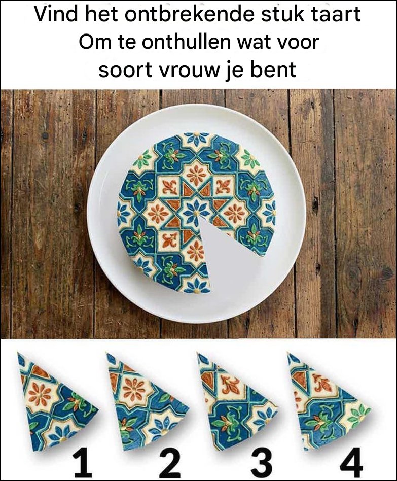 Persoonlijkheidspuzzels gebaseerd op visuele keuzes zijn erg populair geworden omdat ze observatie, intuïtie en een beetje zelfreflectie combineren. De afbeelding hierboven toont een prachtig gedecoreerde taart waarvan één stuk ontbreekt. Daaronder liggen vier mogelijke stukken die in de lege ruimte zouden kunnen passen.